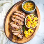- Slice the rested pork tenderloin and serve topped with mango-pineapple salsa.
